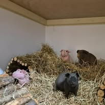 We have hand built spacious indoor hutches, all of which are suitable for up to four guinea pigs. Each hutch has its own spacious hidey end that is full of fresh hay and lined with paper bedding which is changed daily, they also have plenty of toys and enrichment games.